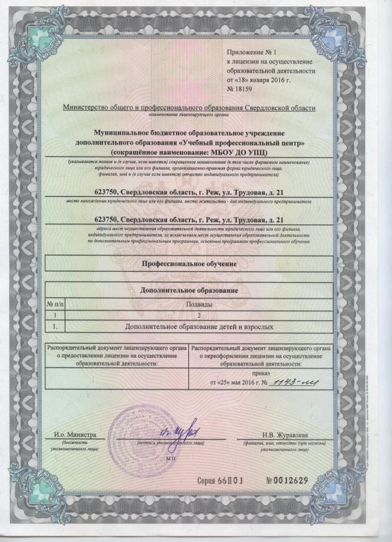 - Места осуществления образовательной деятельности по основным программам профессионального обучения: Свердловская область, г.Реж, ул.Трудовая, 21